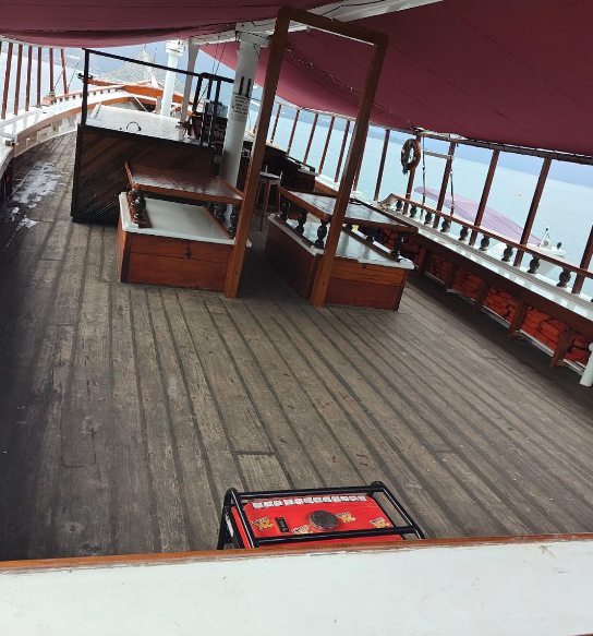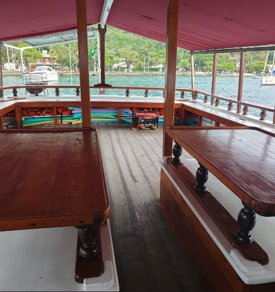 A embarcação conta com ampla área externa para apreciação da paisagem, espaços cobertos para conforto, som ambiente e estrutura pensada para garantir segurança e bem-estar de todos os passageiros durante o trajeto.