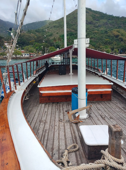 Uma escuna com capacidade para até 100 pessoas, ideal para passeios em grupo, confraternizações, eventos corporativos e comemorações especiais em Ilhabela.